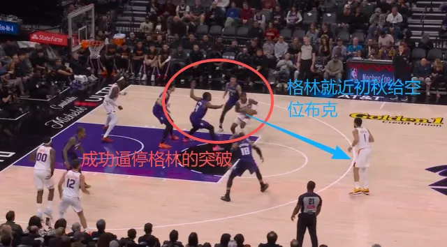 格林突破被阿丘瓦协防逼停后就近出球给弧顶空位的布克,威少预判其传球意图后迅速上前单手完成抄截。