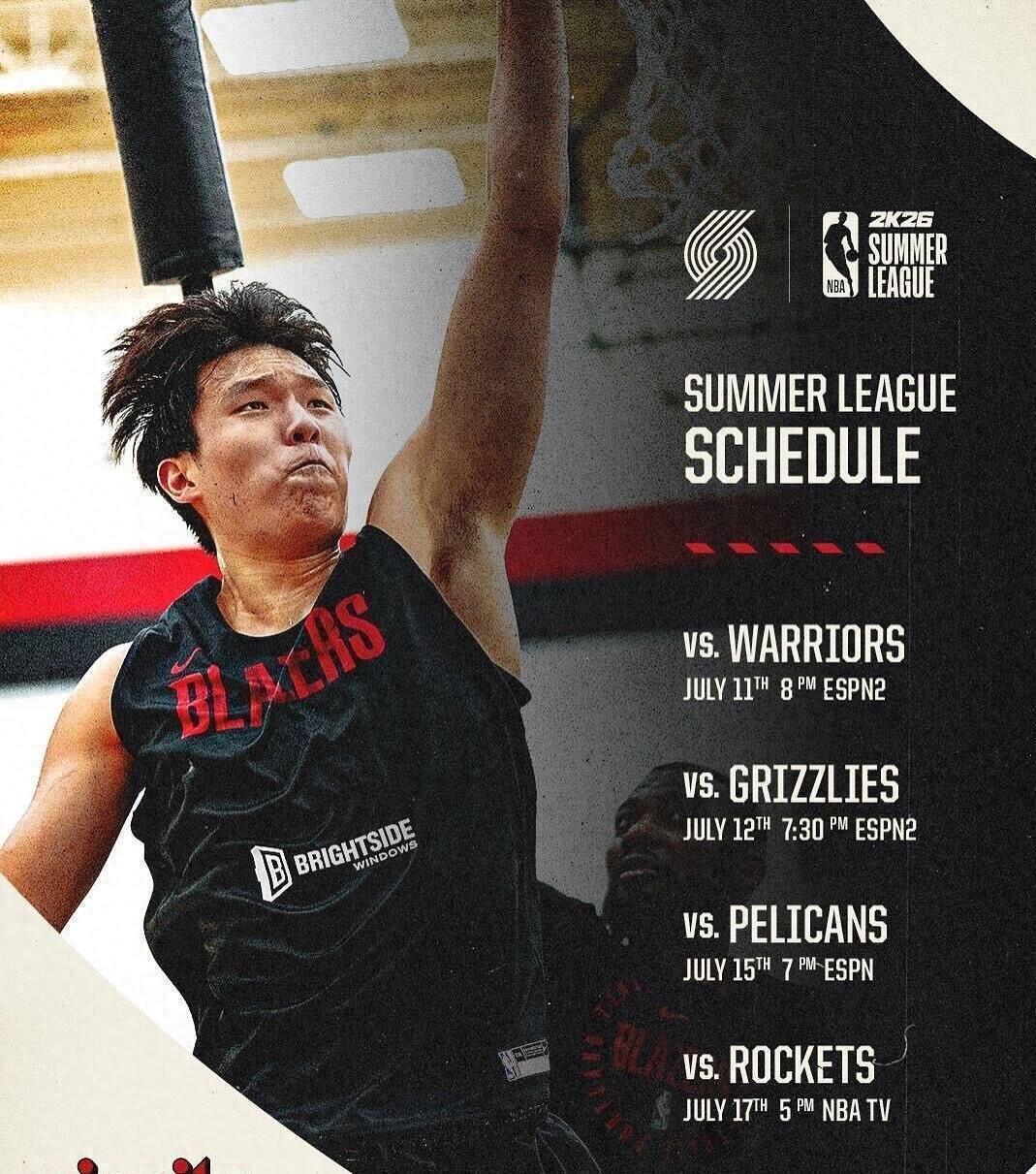 开拓者此前已经发布了夏联的赛程,首战定于北京时间7月12日,对手是勇士。随后他们将在7月13日对阵灰熊,7月16日对阵鹈鹕,7月18日和火箭交锋。杨瀚森独占开拓者夏联赛程海报的封面,近期,开拓者也非常重视杨瀚森的加盟,社媒多次更新和他相关的动态。