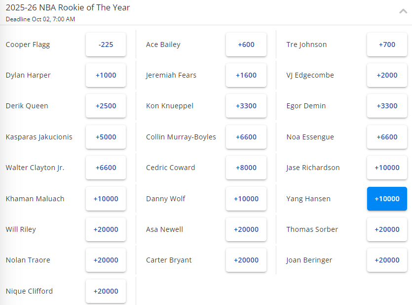 虽然杨瀚森一场NBA比赛还没打,但外界对他的预期在逐渐提升。一周前,杨瀚森在年度最佳新秀赔率榜上的排名是并列第27位,赔率是+25000。当时有报道称,一位北卡州的球迷买了25美元的杨瀚森当选最佳新秀,如果实现,他将收回6275美元。
